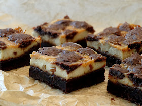 Bake in the oven for 30-40 minutes, until the cheesecake is firm around the edges with just a bit of wobble in the middle. Leave to cool, then place in the fridge to set before slicing into squares and serving.